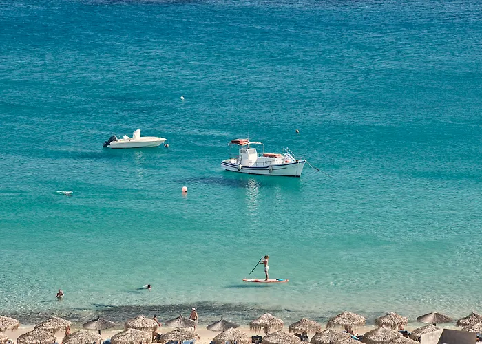 Gelegen op 3 km afstand van het Landbouwmuseum, beschikt het fantastische Myconian Ambassador Relais & Chateaux Platys Gialos hotel met 5 sterren over 69 kamers met uitzicht op de zee. Bij het Griekse restaurant van het hotel, dat in dit winkelgebied van de stad ligt, wordt een menu uit de Griekse keuken geserveerd.
